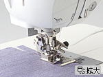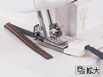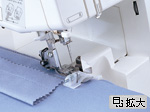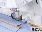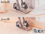 溝がついたこの押えを使うと、ロックミシンなどで縫い合わせたぬいしろを倒して、6mmまたは3mm幅の2本針3本糸カバーステッチで簡単に押えミシンをかけることができます。